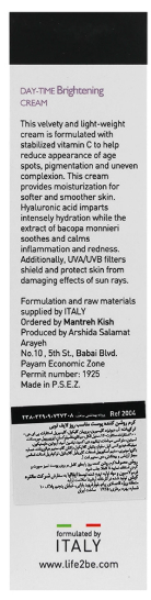 کرم روشن کننده روز لایف توبی (Day-time Brightening Cream - Life2be) با بافتی سبک به همراه ترکیبات ویژه روشن کننده به جهت بر طرف کردن لک ها، تیرگی ها و ایجاد ظاهر یکنواخت پوست، فرموله شده است.همچنین ترکیبات جوان کننده و آبرسان موجود در این کرم فورا رطوبت را به پوست بازگردانده و از پوست در مقابل چین و چروک های سطحی محافظت می کند. وجود فیلترهای محافظ در برابر اشعه UV آفتاب و همچنین ترکیبات ضد التهاب در این کرم، از اثرات مخرب نور خورشید و بروز التهاب و قرمزی جلوگیری می کند.